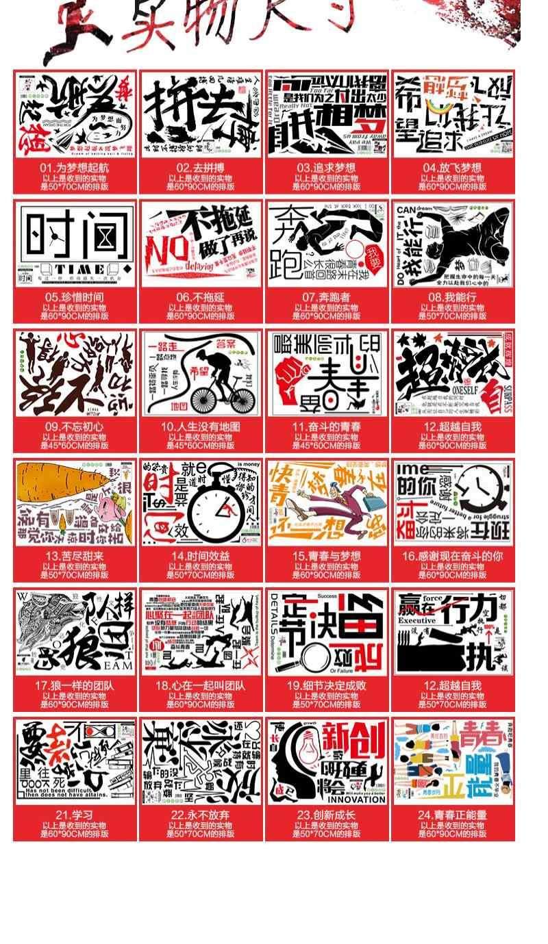 - 顏色分類:【為夢想起航】【去拼搏】【追去夢想】【放飛夢想】【珍惜時間】【不拖延】【不忘初心】【人生沒有地圖】【奮斗的青春】【超越自我】【苦盡甜來】【時間效益】【青春與夢想】【感謝現(xiàn)在奮斗的你】【狼一樣的團隊】【心在一起叫團隊】【學習】【永不放棄】【今天你努力了沒有】【細節(jié)決定成敗】【贏在執(zhí)行力】【創(chuàng)新成長】【青春正能量】【我能行】
