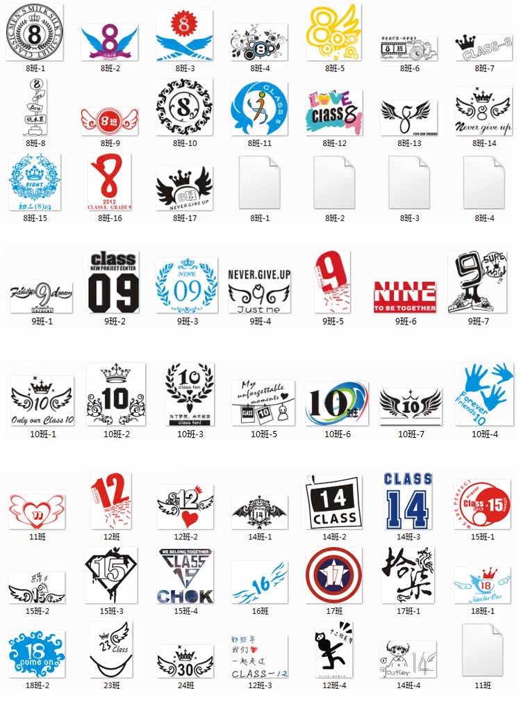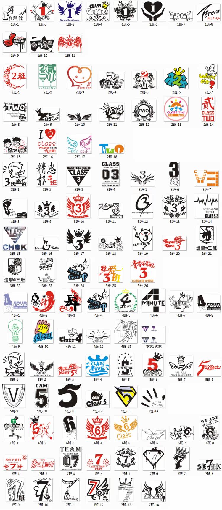 班级学校学生班服校服队服T恤图案班级号码班标设计素材 CDR矢量图,JPG高清图片。共156个班号文件,是打包发到您QQ邮箱的。