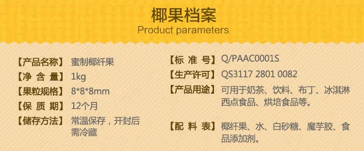 - 配料表:椰纖果、水、白砂糖、魔芋膠、食品添加劑