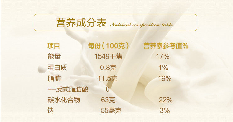 - 配料表:速溶茶粉、白砂糖、植脂末、麥芽糊精、食品添加劑、食用香精。