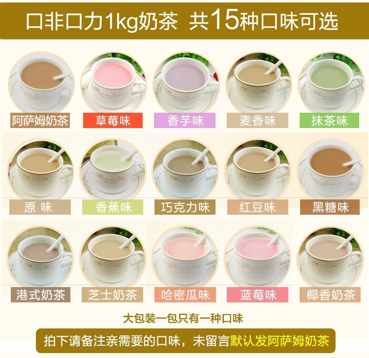 商品口味:本款奶茶一共有27種口味:樂瑞思:【原味、香芋、哈密瓜、草莓、西瓜、菠蘿、巧克力、芒果 、紅豆、紅棗、藍(lán)莓、】,東具:【原味奶茶、香蕉味奶茶、香芋味奶茶、草莓奶茶、原味巧克力、烏龍奶茶、黑糖奶茶、柳橙奶茶、花生巧克力、抹茶奶茶、藍(lán)莓奶茶、麥香奶茶】。口非口力口味有:【阿薩姆、原味、草莓、香芋、麥香、抹茶、哈密瓜、香蕉、巧克力 、紅豆 、黑糖 、港式奶茶 、芝士奶茶 】德美林:【麥香椰漿、杏仁、原味、紅棗、草莓、巧克力、抹茶、藍(lán)莓、香芋】一袋為一種口味,親需要什么口味自己留言備注或者客服備注,如果沒有留言備注口味,默認(rèn)發(fā)口非口力阿薩姆奶茶