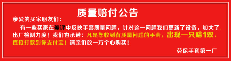 三、本廠承諾:收到破損手套,有一補二,打款支付寶!