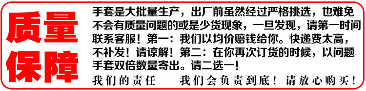 在發(fā)貨前,工人們都會仔細檢查,但是也很難保障你收到的手套沒有破損的,如果收到破損的手套,請不要擔心,請盡快我們,我們會進行補償,有一雙補2雙的錢打入你的支付寶!非常大的保障您的利益!