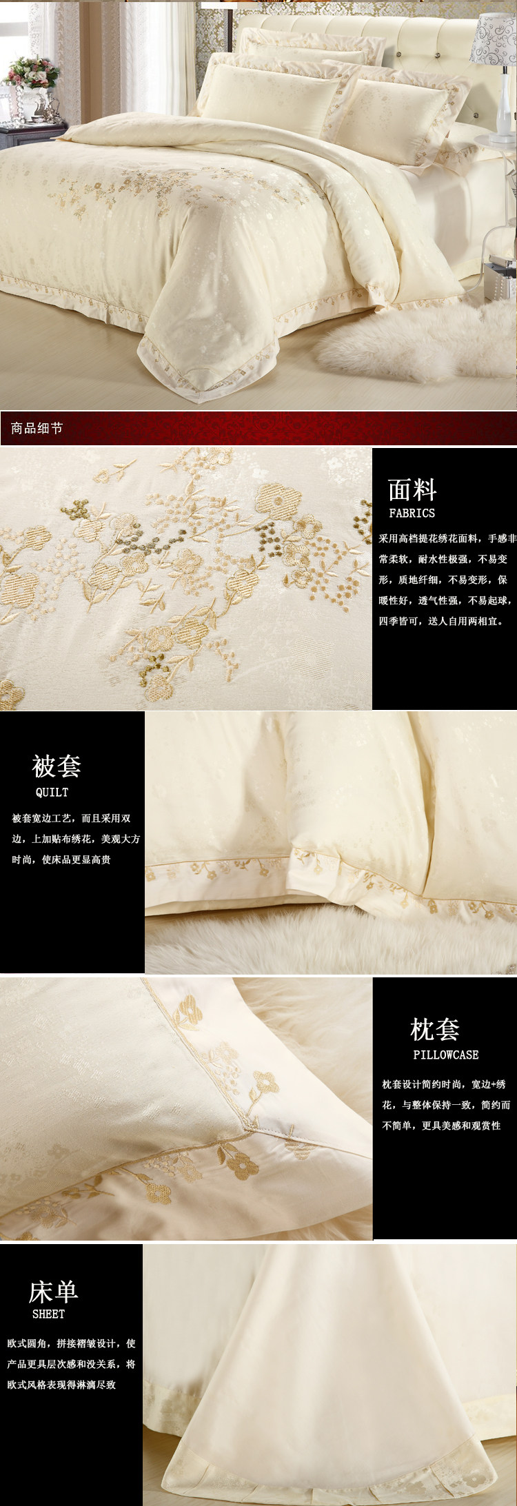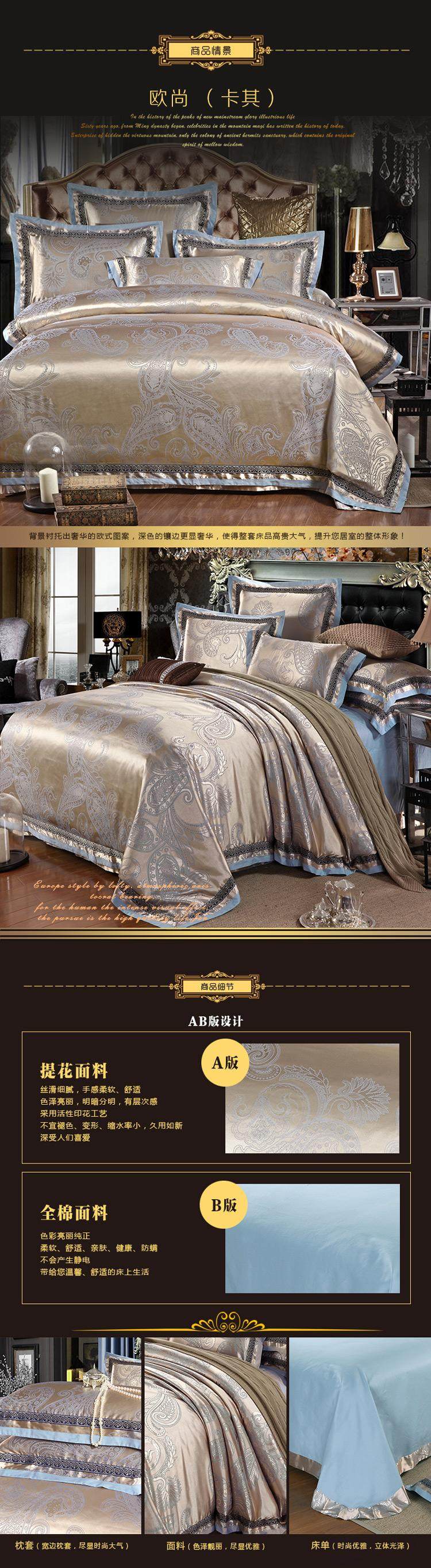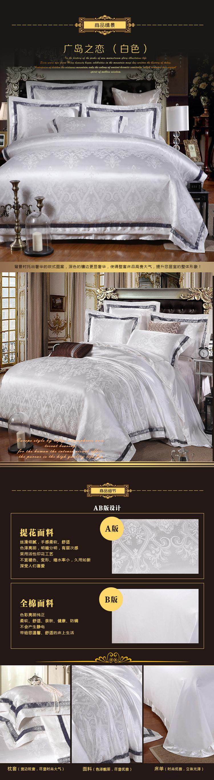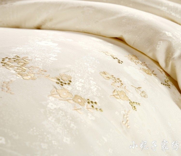 面料材質(zhì) | T293 純棉 貢緞/JC40S/60S/173*120/緞紋 工藝:鑲牙條 重量:3.5KG--4.2KG 工藝:提花+繡花 |