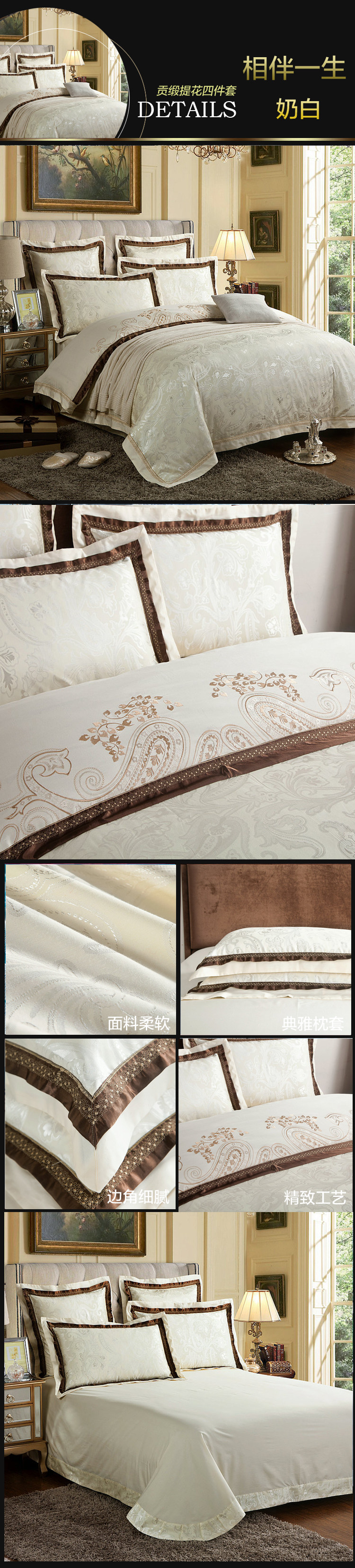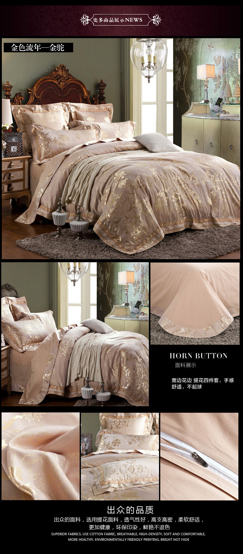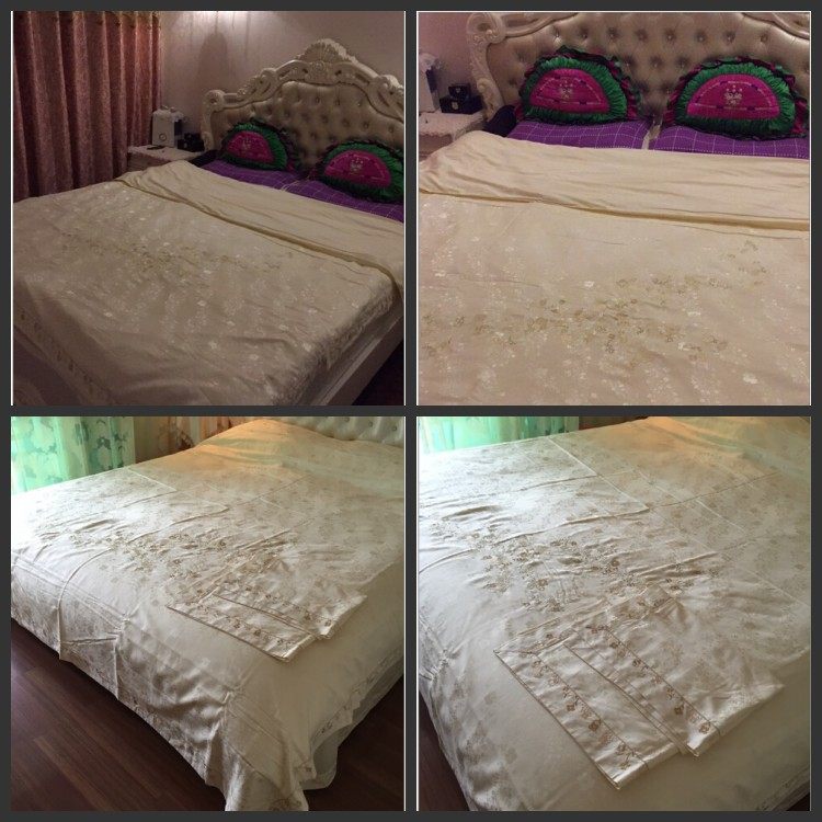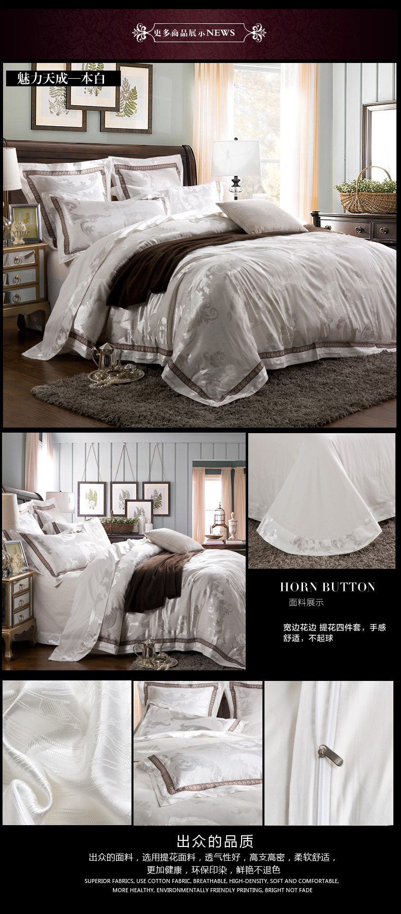 面料材質(zhì) | T293 純棉 貢緞/JC40S/60S/173*120/緞紋 工藝:鑲牙條 重量:3.5KG--4.2KG 工藝:提花+繡花 |