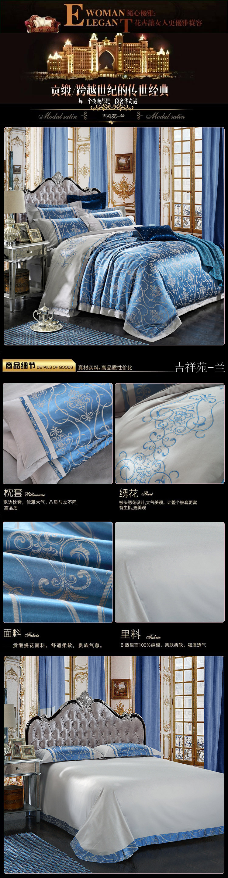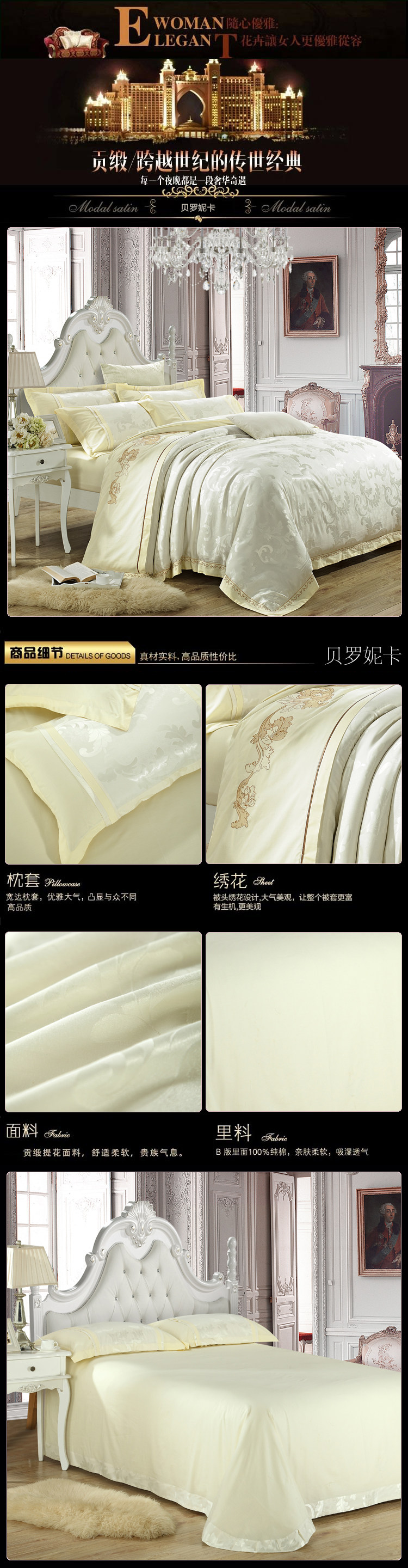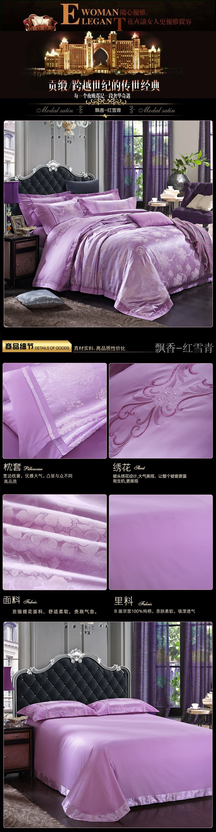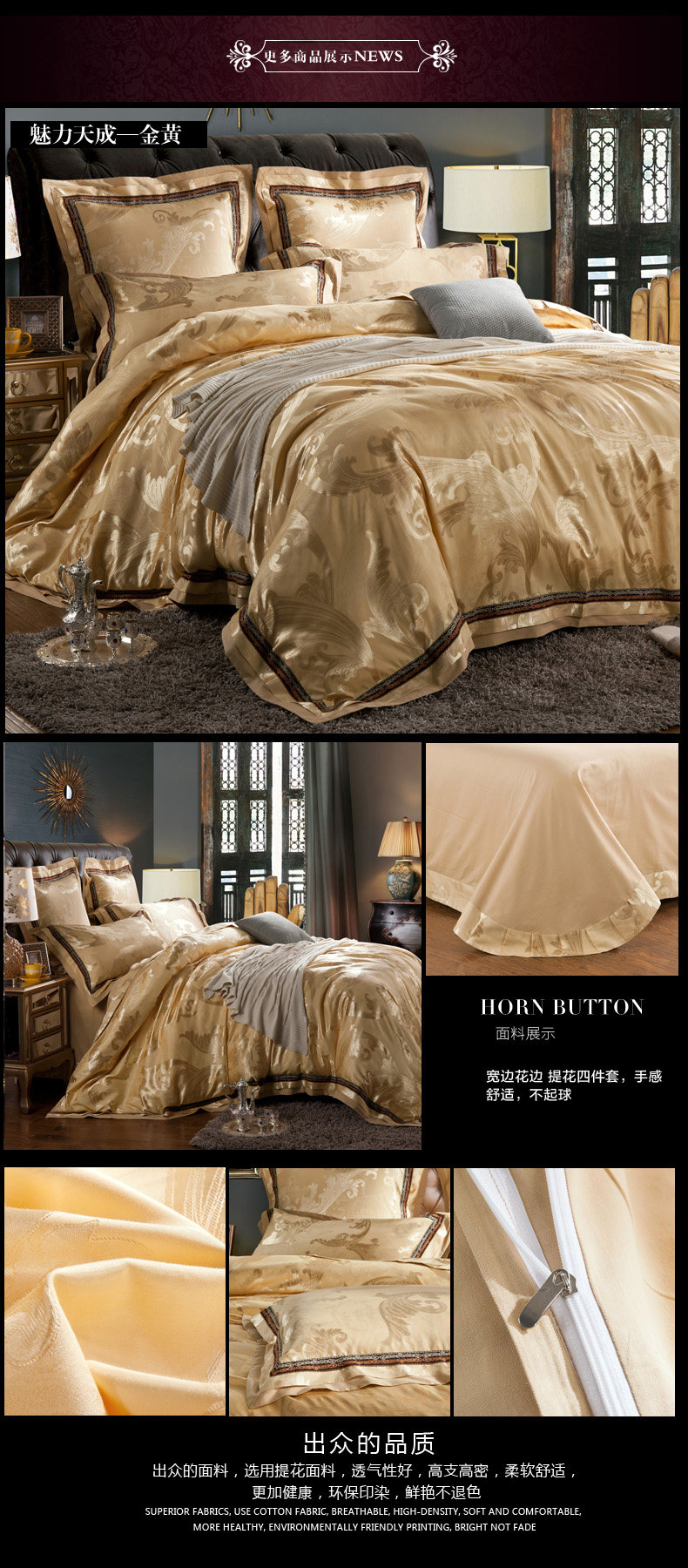 面料材質(zhì) | T293 純棉 貢緞/JC40S/60S/173*120/緞紋 工藝:鑲牙條 重量:3.5KG--4.2KG 工藝:提花+繡花 |