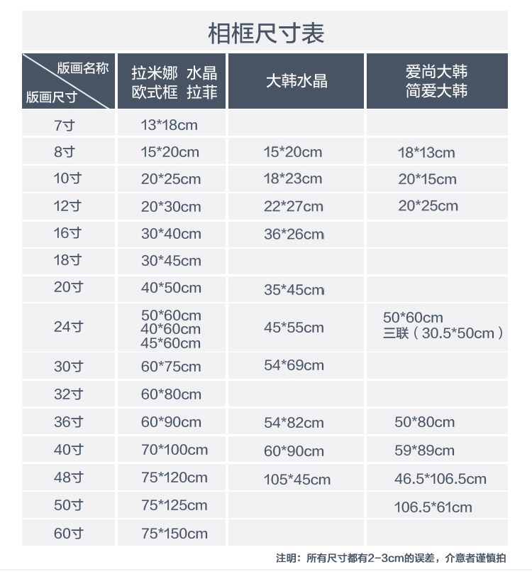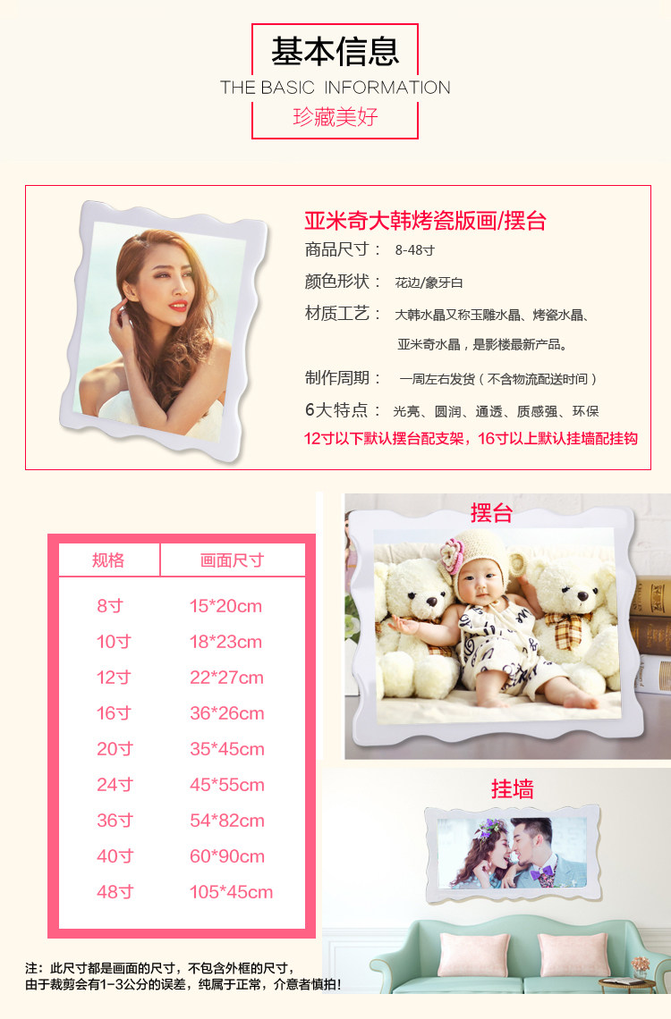 尺寸表(制作水晶版画的尺寸和标准照片尺寸相差不多 误差在3到5毫米之内)