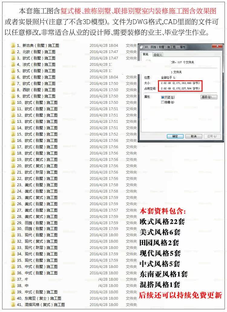 【文件说明】 本套图为室内别墅装修施工图、图纸包含了欧式风格22套、中式风格5套、现代