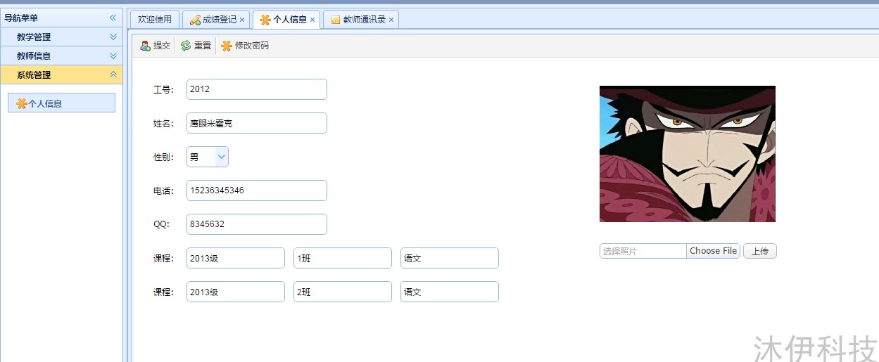 接下來我們按照教師的角色登錄,教師登錄用戶名2012,密碼111111 ,教師主要功能有:教學管理、教師信息管理、個人信息管理。