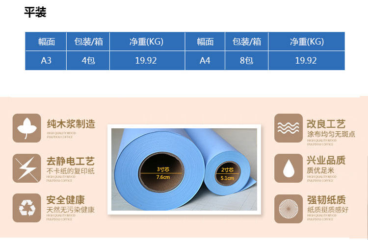 - 幅面:A3297mm*150米/卷3寸芯A3310mm*150米/卷3寸芯A2440mm*150米/卷3寸芯A1610mm*150米/卷3寸芯A1620mm*150米/卷3寸芯A0880mm*150米/卷3寸芯A3297mm*50米/卷2寸芯A3310mm*50米/卷2寸芯A2440mm*50米/卷2寸芯A1610mm*50米/卷2寸芯A1620mm*50米/卷2寸芯A0880mm*50米/卷2寸芯