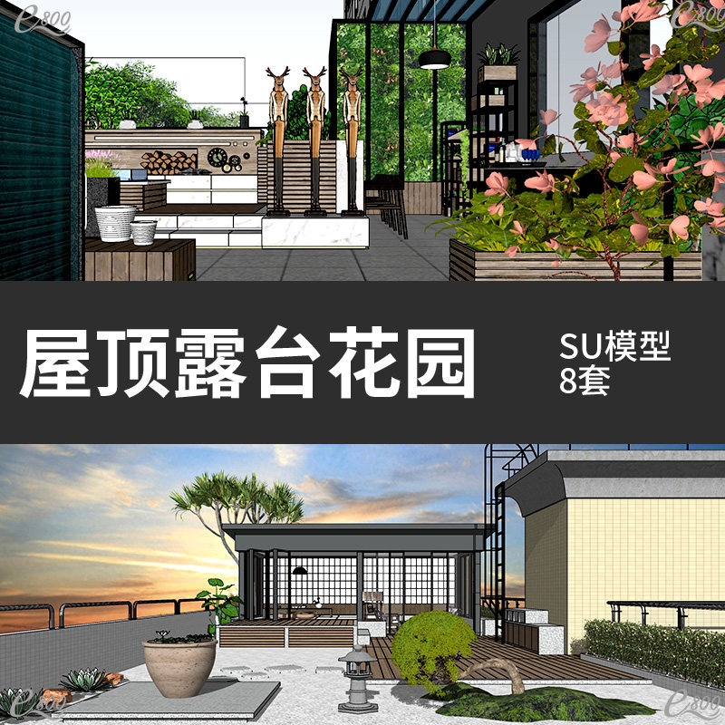 樓頂露臺屋頂花園設(shè)計SU天臺空中花園日式中式別墅庭院景觀SU模型