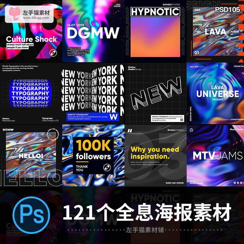121個潮流炫酷全息漸變流體字體背景Instagram海報PSD設(shè)計素材