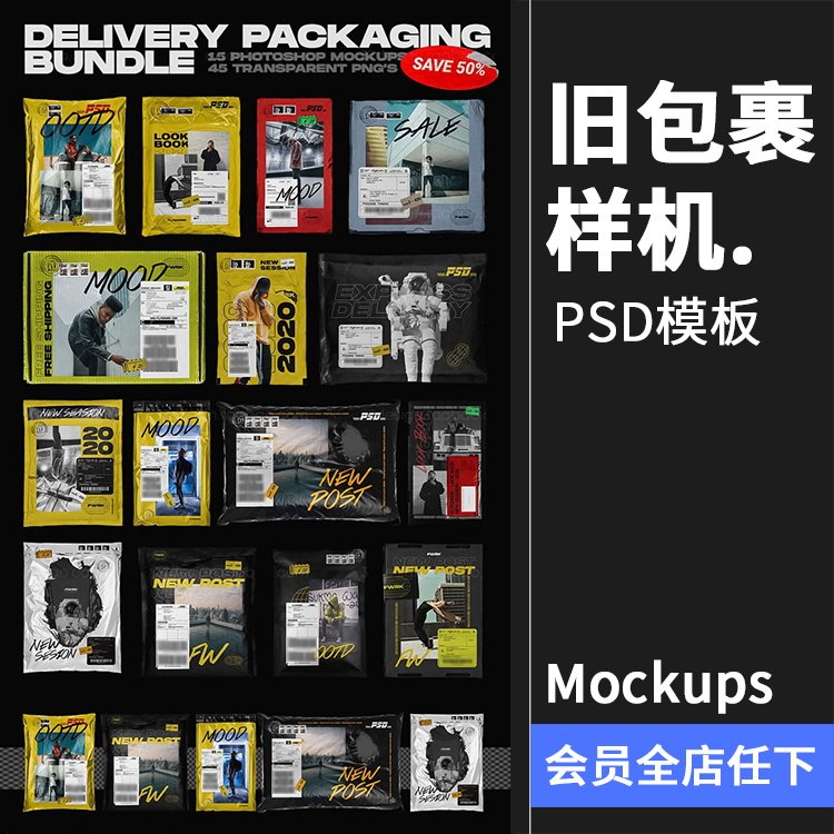 潮流做舊快遞包裹褶皺塑料破舊紋理包裝袋PSD模板材質(zhì)PS樣機(jī)素材