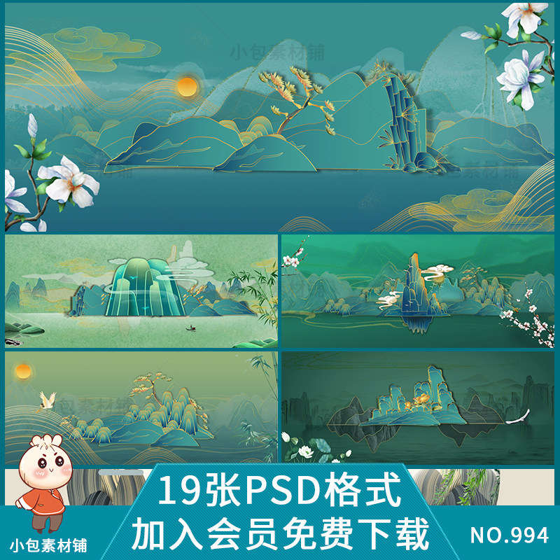 國潮風新中式山水鎏金背景燙金仙鶴手繪插畫psd設計素材海報模板