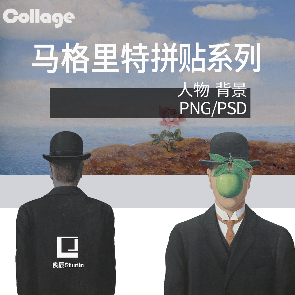 PNG/PSD建筑拼貼素材馬格里特油頭小哥人物天空配景效果圖collage