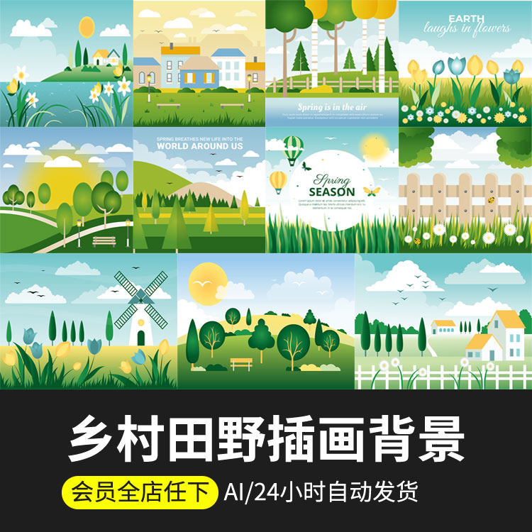 扁平化春天春季田園山莊公路卡通景色橫幅海報(bào)插畫AI矢量設(shè)計(jì)素材