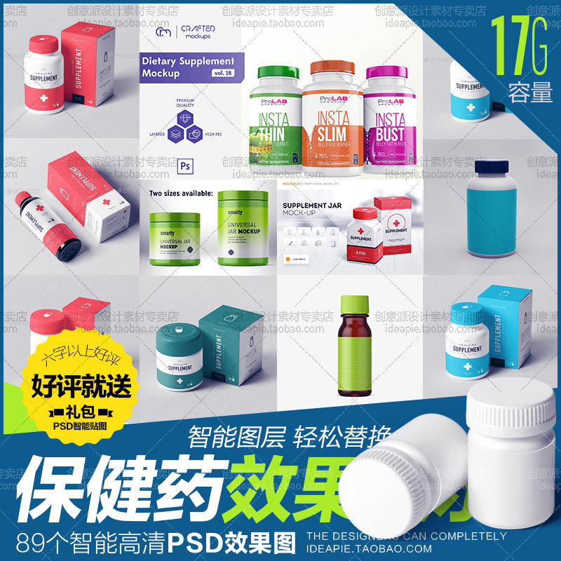 保健品藥瓶包裝展示效果圖盒形瓶裝樣機貼圖設(shè)計提案智能圖層素材