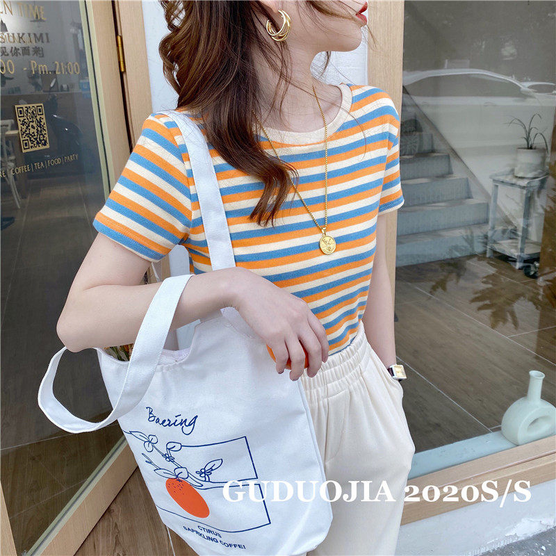 短袖t恤女夏季設(shè)計感網(wǎng)紅2021年新款純棉薄款寬松短款條紋上衣