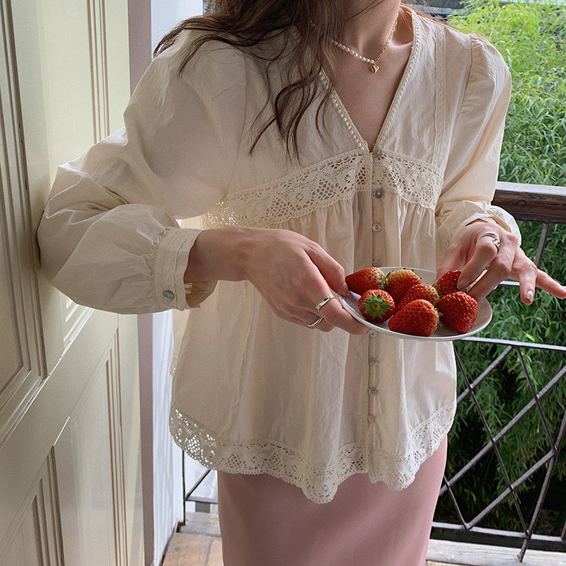 BingDaily蕾絲邊襯衫女2021春夏款寬松v領(lǐng)襯衣洋氣設(shè)計感小眾上衣