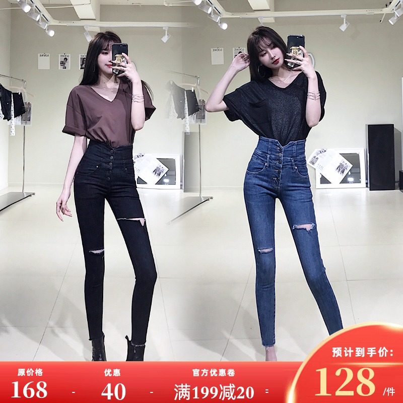 【破洞+排扣】自帶顯瘦特效小腳褲穿了都說(shuō)好的高腰力牛仔褲女