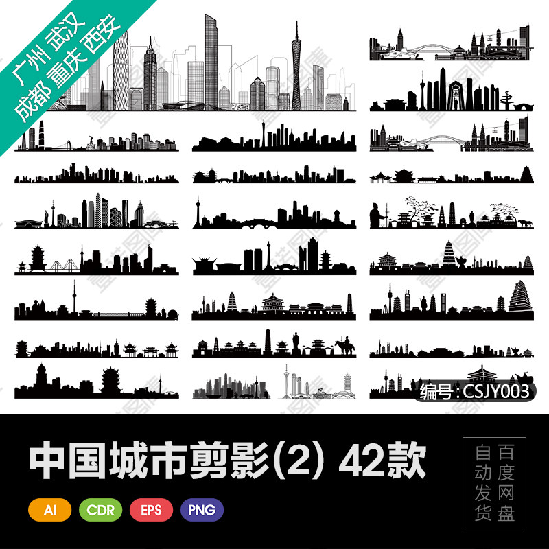廣州重慶成都西安武漢中國(guó)城市地標(biāo)建筑剪影輪廓AI矢量圖設(shè)計(jì)素材