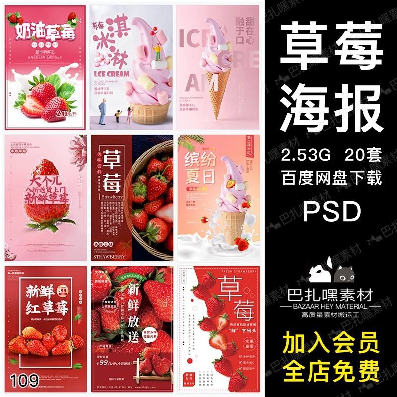 新鮮草莓飲料甜品點(diǎn)心糕點(diǎn)美食店鋪宣傳海報(bào)背景PSD模板設(shè)計(jì)素材