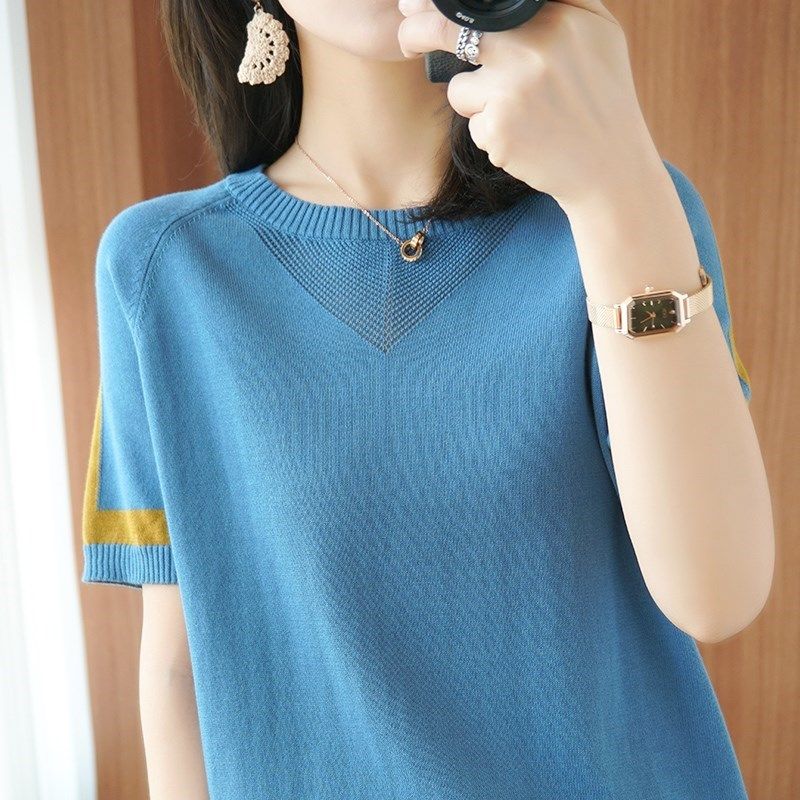 夏季冰絲T恤女短袖設計感2021新款韓版寬松圓領百搭薄款針織上衣