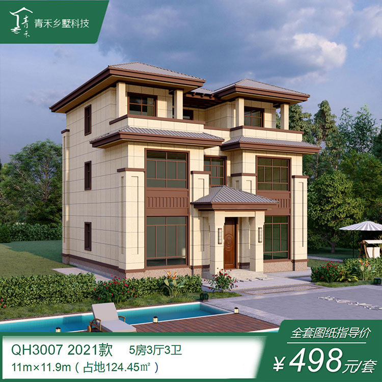新中式農(nóng)村三層仿古三開(kāi)間帶露臺(tái)別墅設(shè)計(jì)圖紙自建房樓房設(shè)計(jì)圖