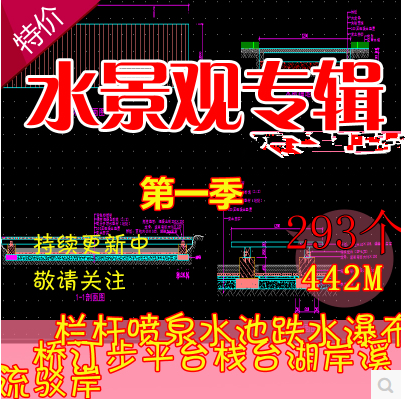 園林景觀CAD施工圖噴泉水池瀑布跌水棧臺園橋駁岸汀步欄桿素材
