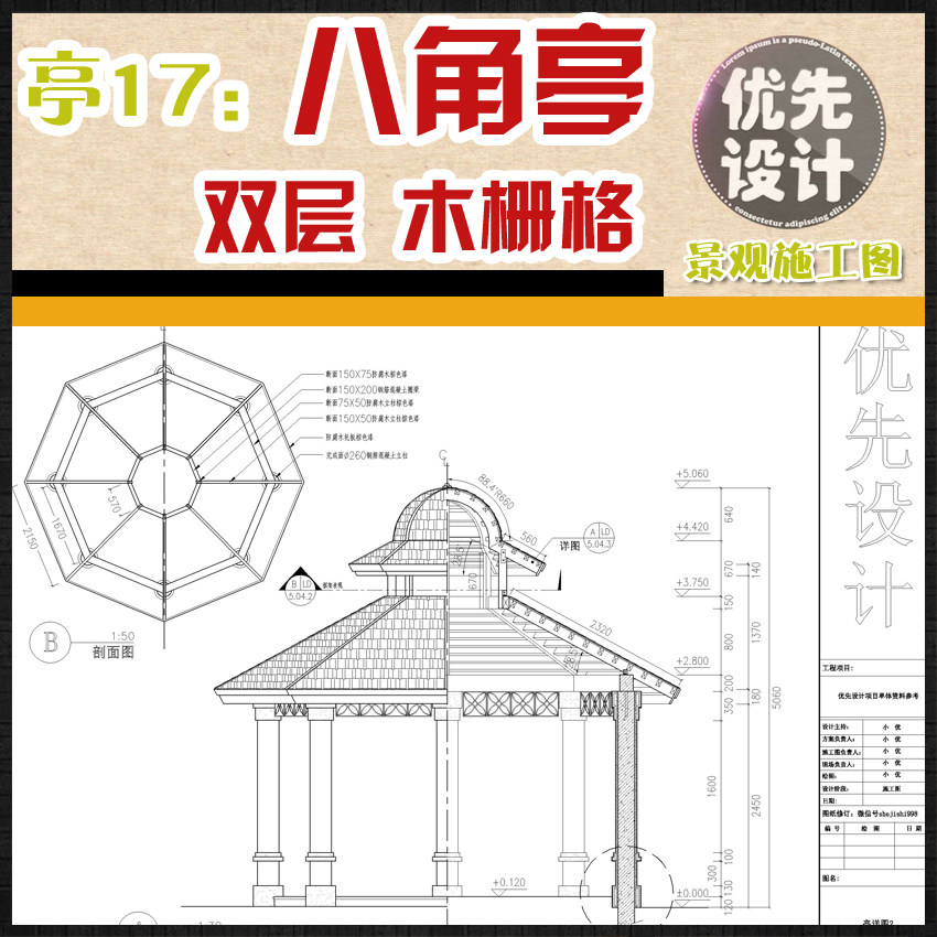 園林景觀(guān)施工圖 園建八角亭雙層木格柵亭 節(jié)點(diǎn)大樣圖CAD圖紙 亭17