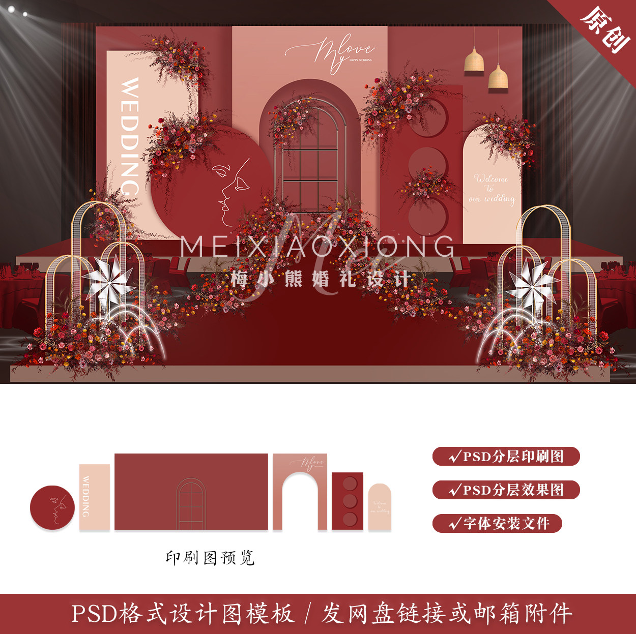 莫蘭迪暗紅色婚禮背景墻設(shè)計(jì)效果圖 婚慶訂婚舞臺(tái)噴繪PSD模板素材