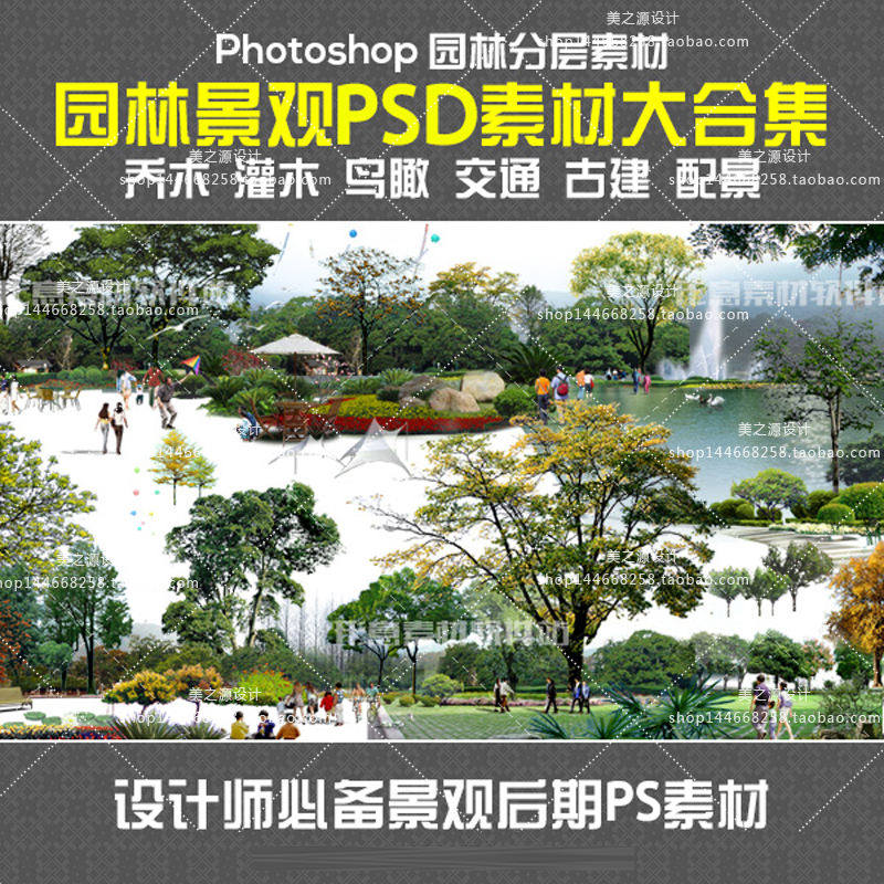 PS后期素材園林景觀設(shè)計PSD古建樹木花草植物人物鳥瞰圖效果圖全