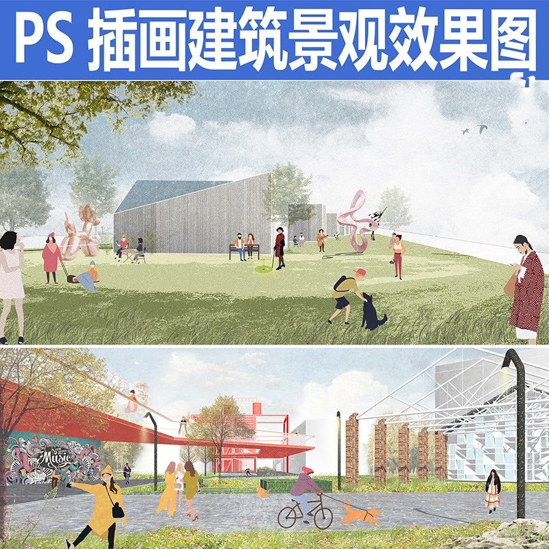小清新插畫風ps效果圖PSD園林景觀建筑分層植物素材collage