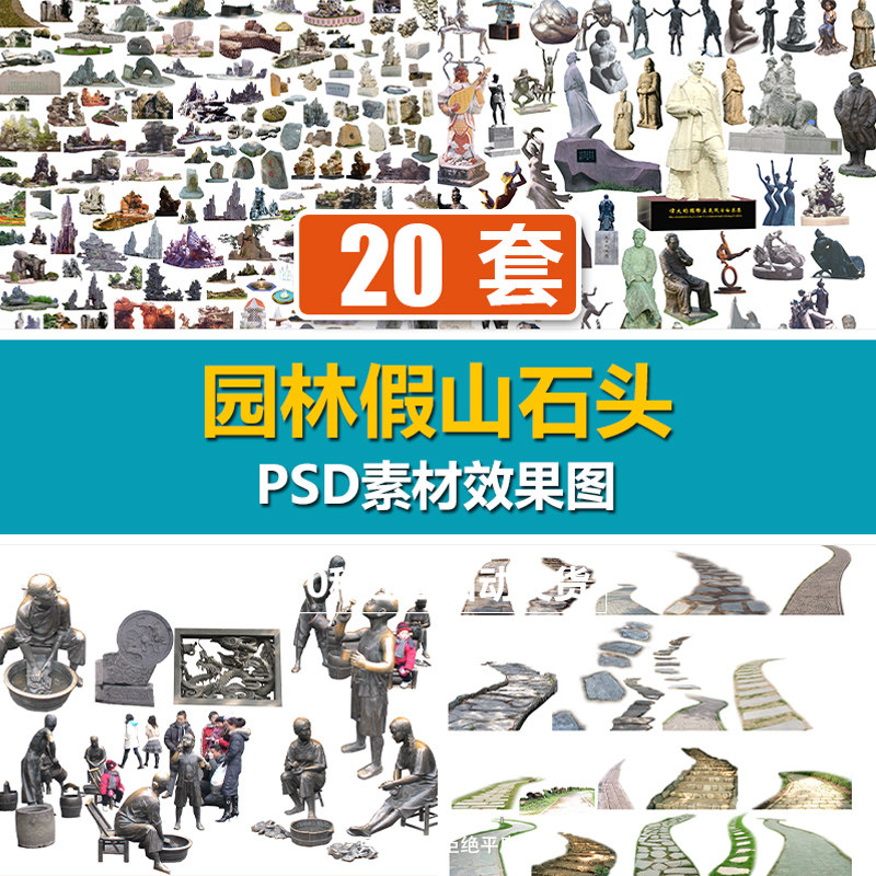 CWD093園林假山石頭歐式人物雕塑鋪磚路景觀效果圖分層psd素材庫(kù)