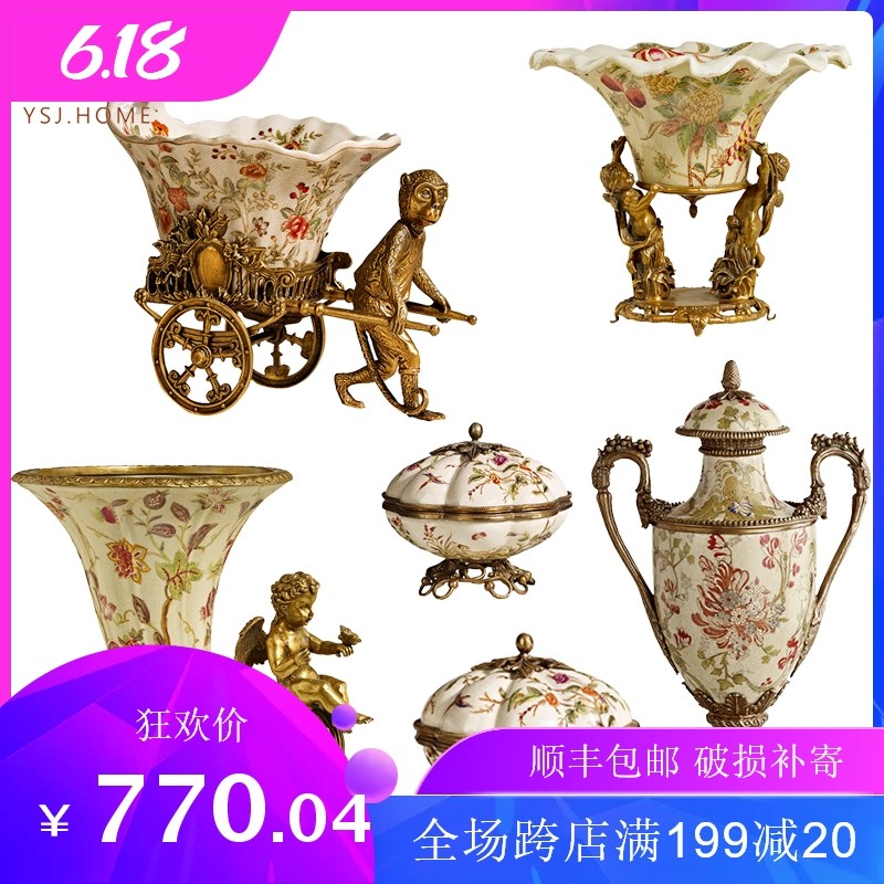 歐式陶瓷配銅美式家居花插果盤客廳玄關(guān)擺件 奢華別墅會(huì)所工藝品