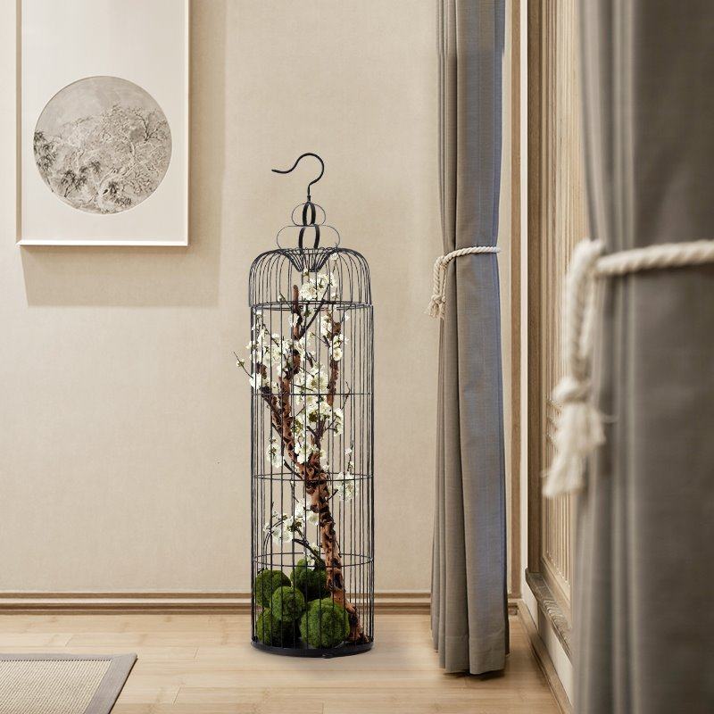 高※檔新中式鐵藝鳥籠花藝擺件黑色落地大號(hào)鳥籠售樓處會(huì)所大堂大
