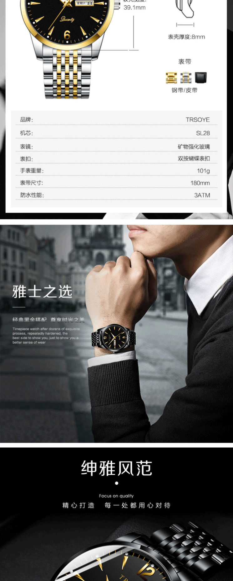 - 手表鏡面材質(zhì):礦物強化玻璃鏡面