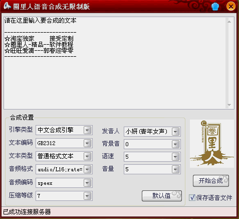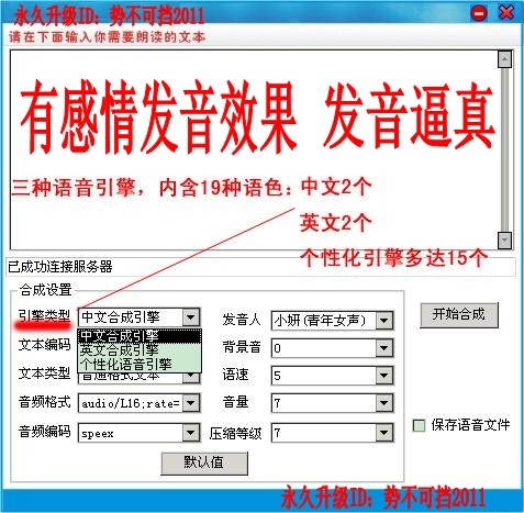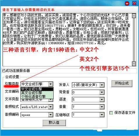 各位賣(mài)家朋友在低價(jià)促銷(xiāo)活動(dòng)的時(shí)候還在為沒(méi)有甜美而不標(biāo)準(zhǔn)的普通話發(fā)愁嗎?請(qǐng)購(gòu)買(mǎi)本小店的這套專業(yè)廣告配音軟件吧,您只需要把你想要搞促銷(xiāo)活動(dòng)的商品廣告詞用文字形式輸入后,它就會(huì)把您輸入的文字逐字逐句的轉(zhuǎn)換成聲音甜美,普通話標(biāo)準(zhǔn)的語(yǔ)音效果,。然后您就可以放在播放設(shè)備里面開(kāi)始叫賣(mài)您的特價(jià)商品了,再也不需要請(qǐng)別人幫您配音,自己想說(shuō)什么,它就能給您配什么語(yǔ)言。特別適合商場(chǎng)、超市的促銷(xiāo)品錄音,軟件簡(jiǎn)單易學(xué),教會(huì)后付款,本軟件還不到1M,純綠色版本,解壓開(kāi)即可使用。含有強(qiáng)大的語(yǔ)音系統(tǒng),