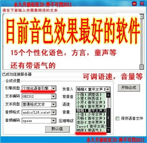 店家是專業(yè)軟件設(shè)計(jì)師 有N年歷史了 這是世上非常好的軟件 值得購(gòu)買(mǎi) 接近真人發(fā)音 語(yǔ)音選擇種類多 很個(gè)性