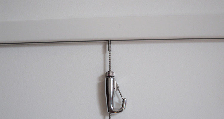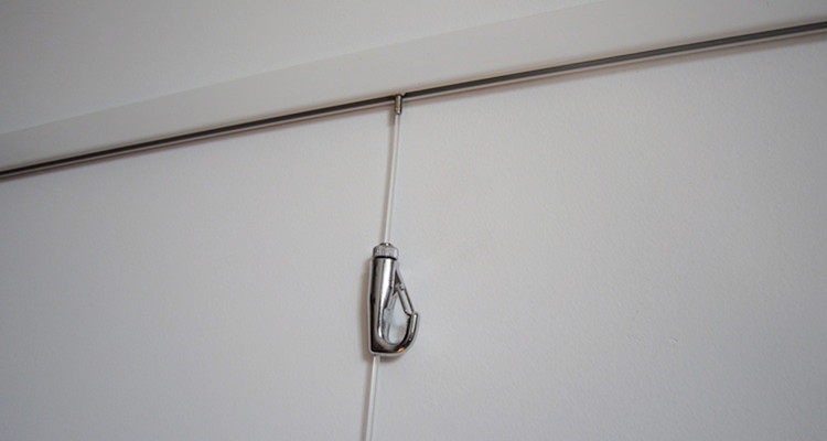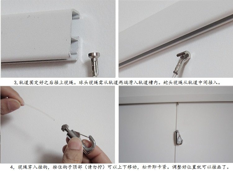- 上下左右調(diào)整好位置,再掛上您的藝術(shù)品。掛繩和掛鉤可以隨時(shí)增減、裝卸。承重許可的情況下,單根軌道可以?huà)於喔鶔炖K。單根掛繩上面可以串多個(gè)掛鉤。