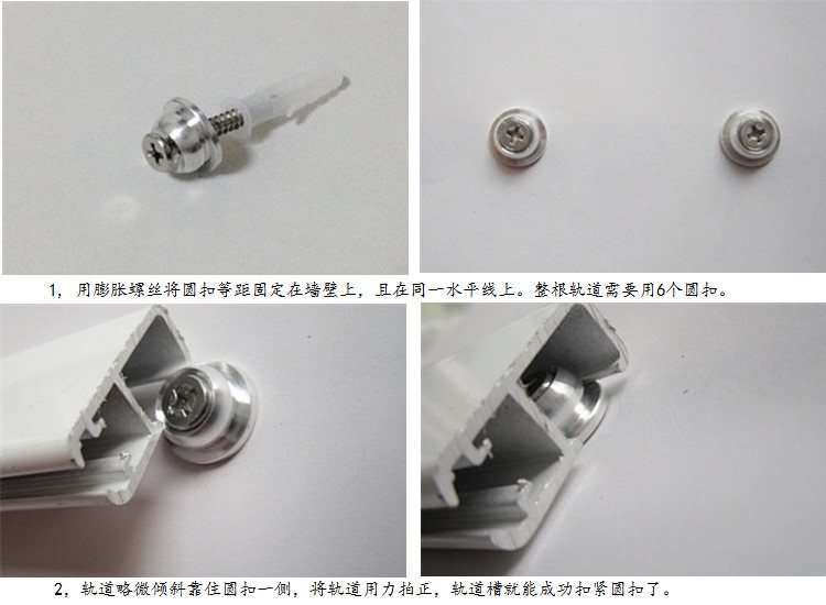 - 用螺絲把圓扣固定在墻上成一條直線(xiàn),整根軌道需要6個(gè)圓扣。切斷的軌道可以酌情等距安裝。