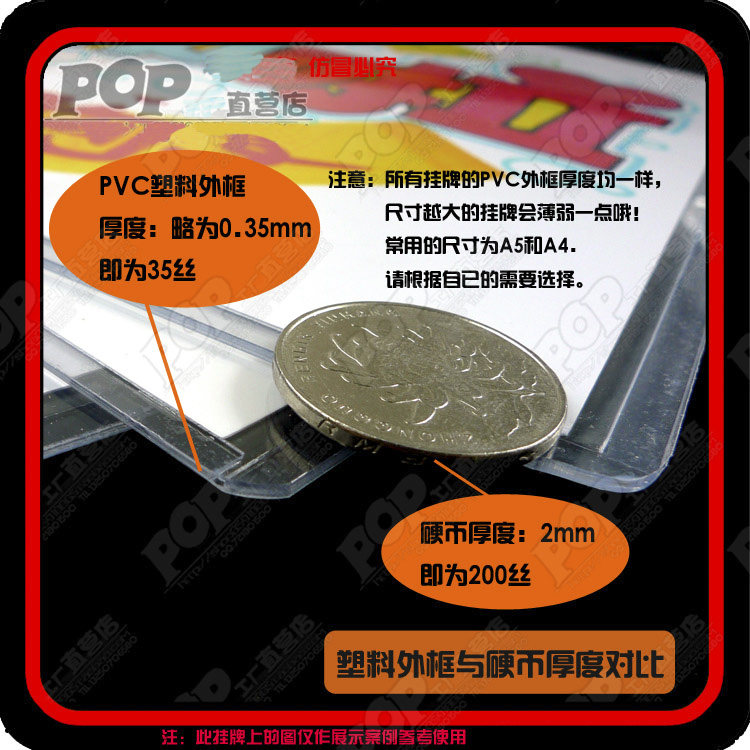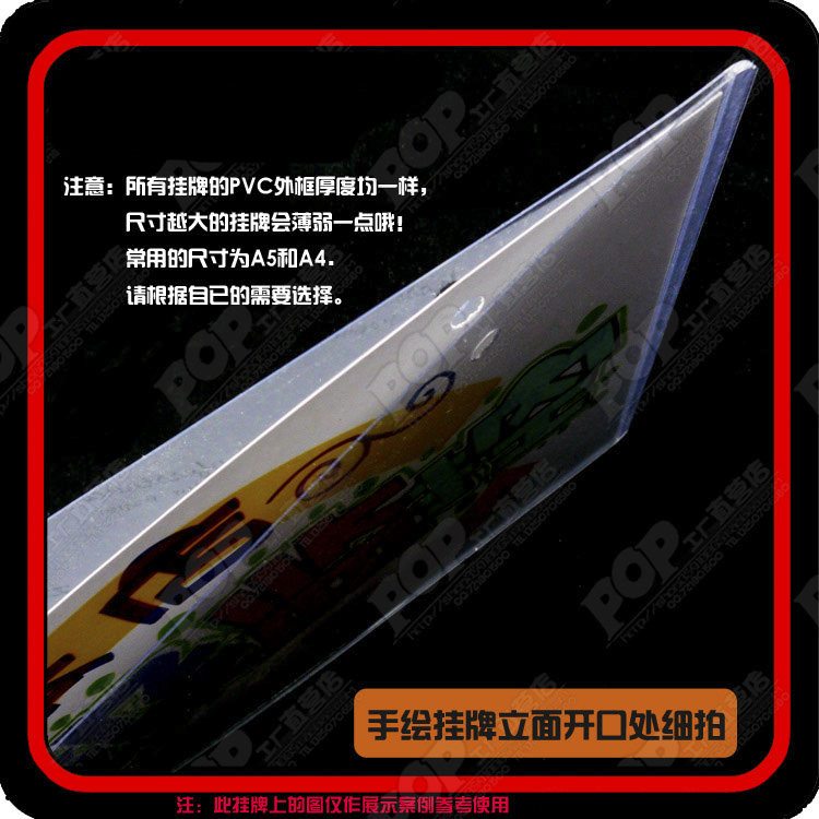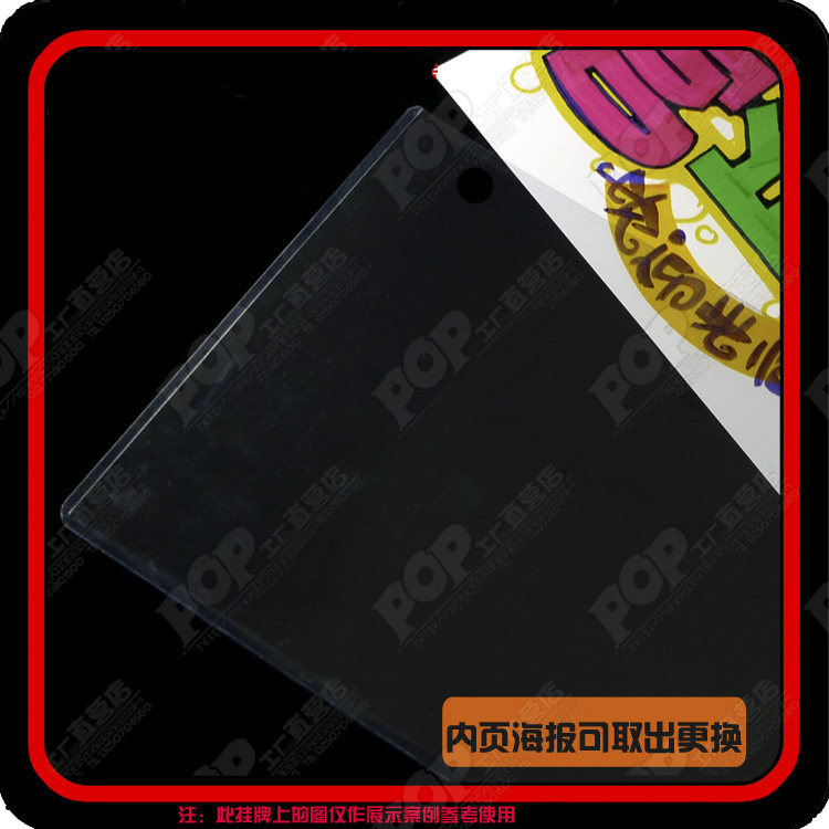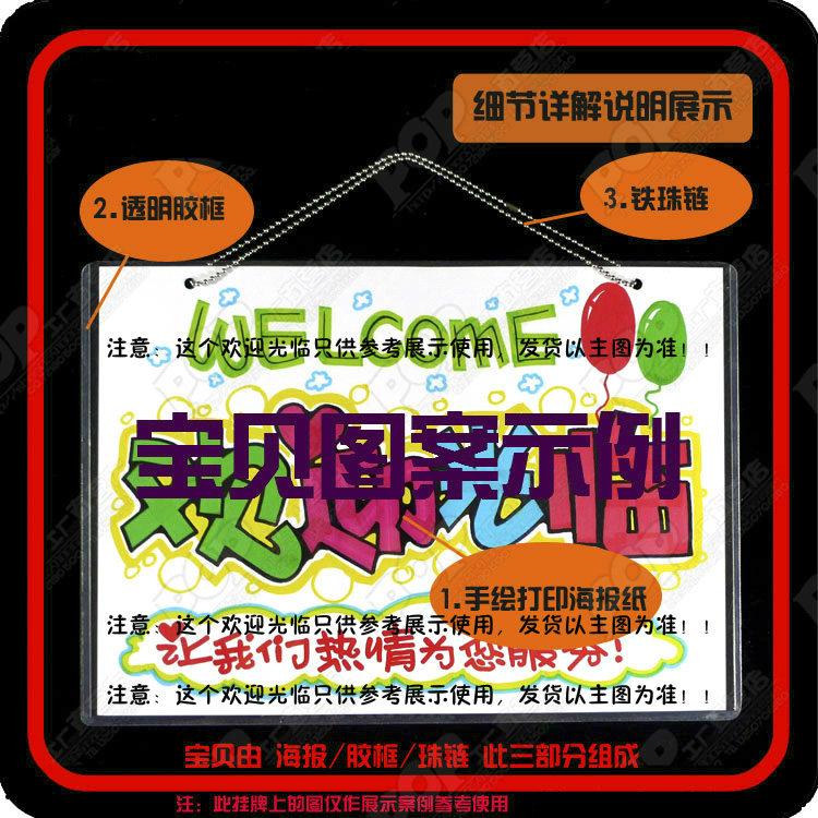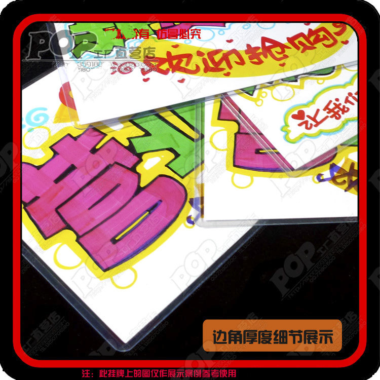 【產(chǎn)品制作】專業(yè)手繪POP設(shè)計(jì)師設(shè)計(jì)后再用POP打印系統(tǒng)打印,外包塑料透明框,連接鐵珠鏈制作而成.