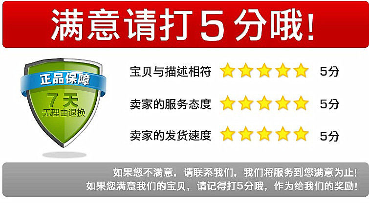 客戶拍下本店寶貝并成功付款后,本店將根據(jù)客戶訂單馬上安排工廠生產(chǎn)。因此:自下單的第二天起,不接受退貨,換貨!有特殊原因需要退換貨的請及時(shí)與掌柜取得!如客戶單方面退換貨