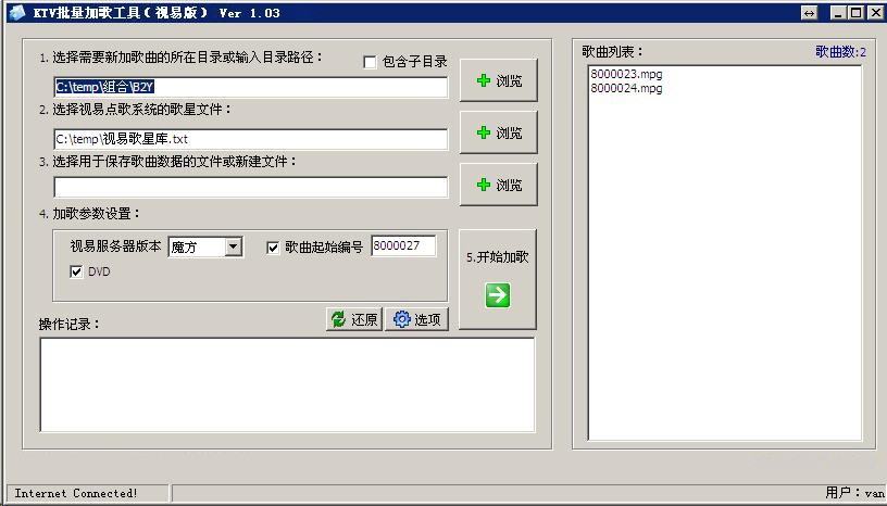 VOD影音點(diǎn)歌系統(tǒng) 批量加歌工具 支持雷石傳奇/星途/3D 等版本,視易魔界、魔方、魔云、鋒云等版本,陽(yáng)光視翰8.0、9.0、10.0、機(jī)頂盒版和PC機(jī)版、前沿IP2009、3D、奧斯卡7.0、8.0,海媚V8V9、天行視點(diǎn)寫(xiě)頭版等各大VOD影音點(diǎn)歌系統(tǒng)運(yùn)營(yíng)商的KTV歌庫(kù)批量加歌入庫(kù)。可根據(jù)客戶要求制定批量加歌軟件入庫(kù)工具,讓您的KTV場(chǎng)所加歌更加簡(jiǎn)單快捷!