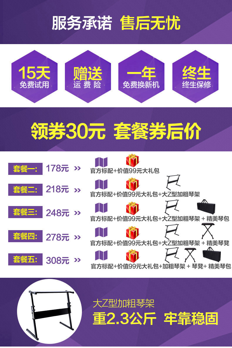 - 顏色分類:官方標(biāo)配+價(jià)值99元初學(xué)禮包官方標(biāo)配+價(jià)值99元初學(xué)禮包+大Z型加粗琴架官方標(biāo)配+價(jià)值99元初學(xué)禮包+大Z型加粗琴架+精美琴包官方標(biāo)配+價(jià)值99元初學(xué)禮包+大Z型加粗琴架+精美琴凳官方標(biāo)配+價(jià)值99元初學(xué)禮包+大Z型加粗琴架+精美琴包+精美琴凳