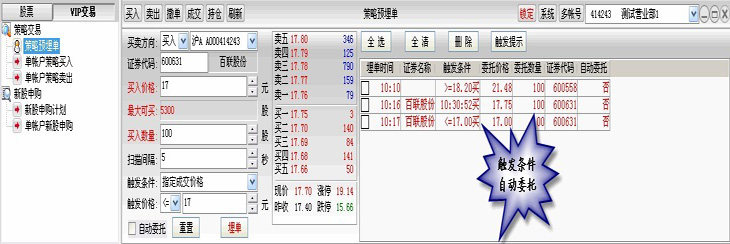策略預(yù)埋單通過設(shè)定觸發(fā)條件來實現(xiàn)自動委托。