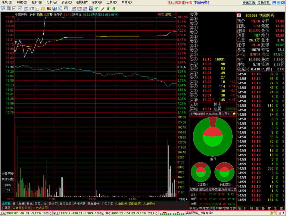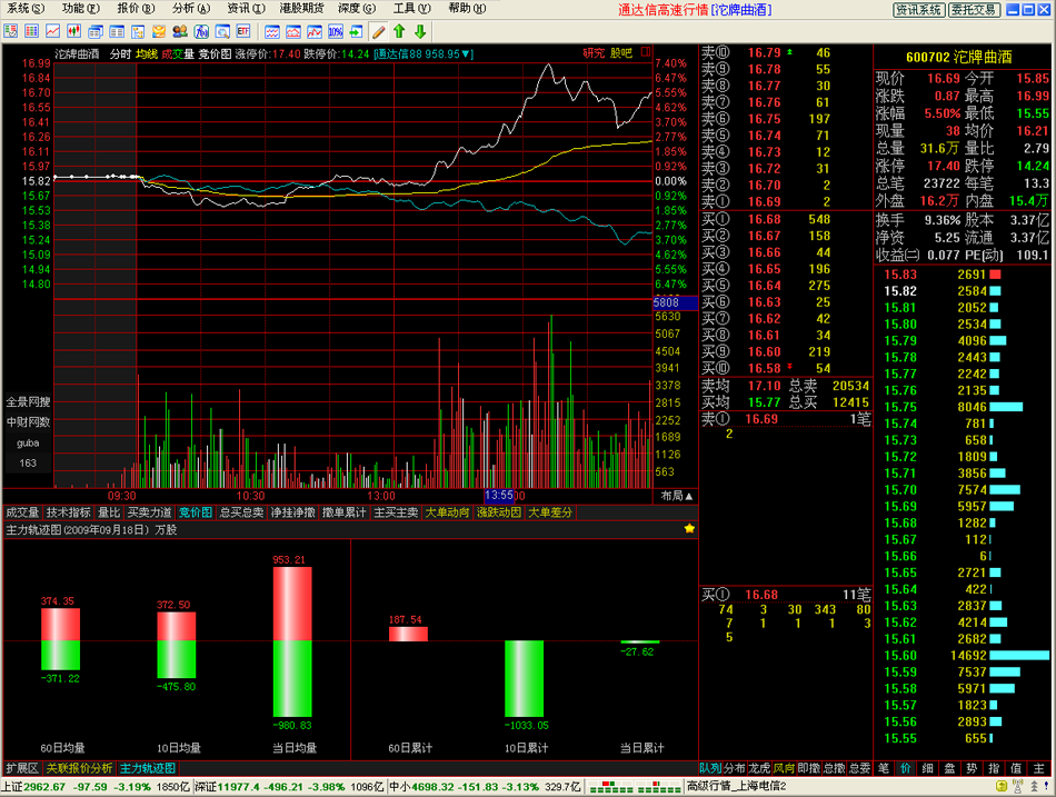 操作時首先進(jìn)入個股分時圖,然后進(jìn)入主力軌跡圖。