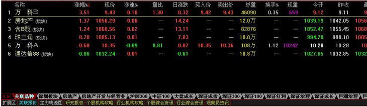 用戶首先進(jìn)入個股的分時走勢圖,點擴展區(qū),然后選擇“關(guān)聯(lián)報價”;點擊下面的“關(guān)聯(lián)品種”將會顯示個股關(guān)聯(lián)品種的行情信息,如下圖: