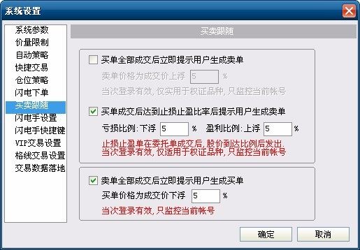 買賣跟隨:當(dāng)用戶買單或賣單成交后,達(dá)到設(shè)定的比例提示用戶生成相反方向的賣單或買單;或是當(dāng)買單成交后達(dá)到止損止盈比例提示用戶生成賣單。