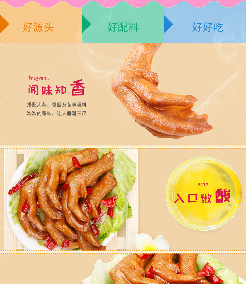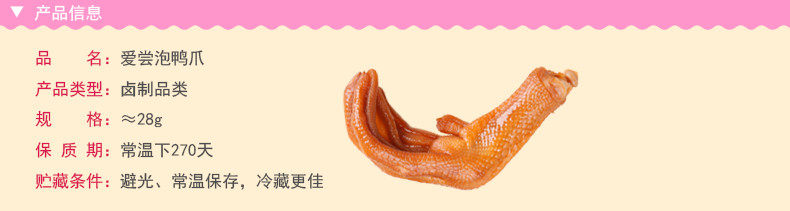 - 配料表:鴨爪、飲用水、醬油、食用鹽、味精、食品添加劑(冰乙酸、乙基麥芽酚、雙乙酸鈉、脫氫乙酸鈉、食用香料)